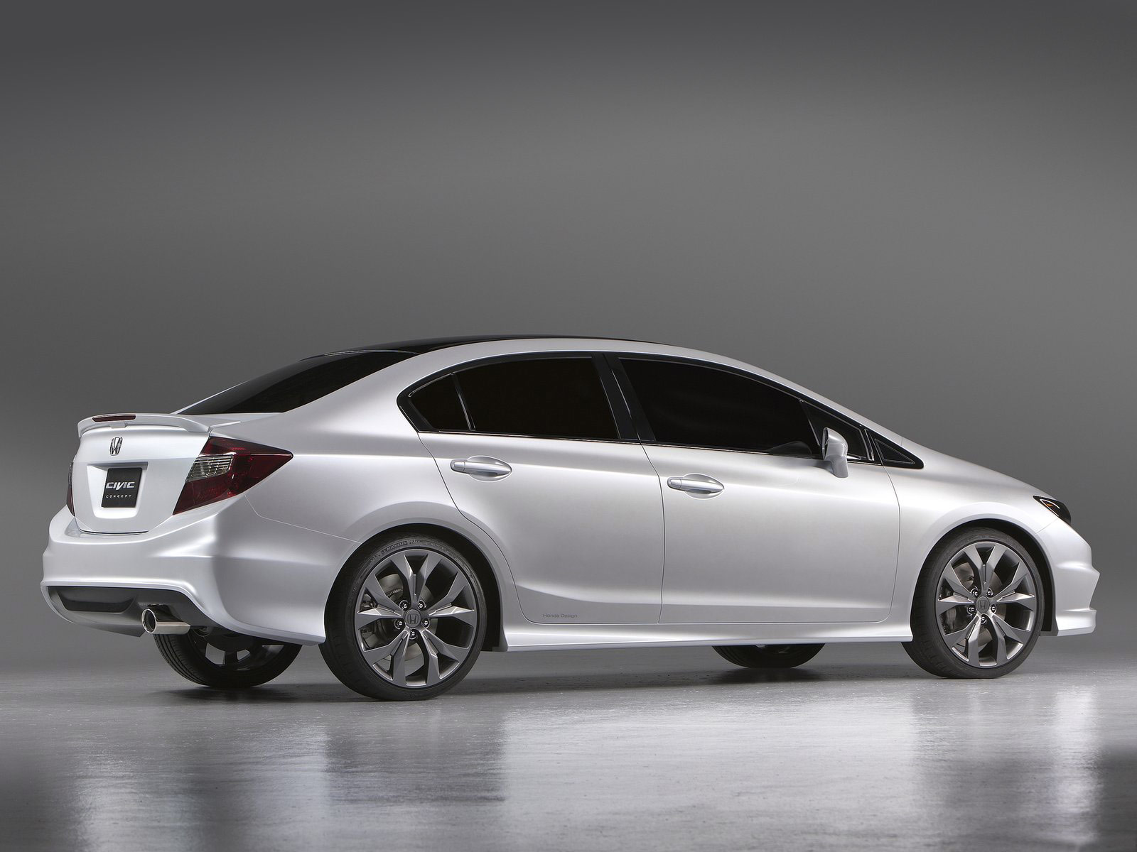 The Honda Civic Concept sedan takes on a sophisticated presence with a front grille defined by crisp lines and a solid bar that integrates a chrome Honda emblem. The look of the Honda Civic Si Concept coupe conveys an aggressive demeanor with a more angular front fascia, mesh grille and a tapered rear roofline that flows smoothly into the trunk. The Honda Civic Si Concept coupe is exclusively equipped with a rear air diffuser, a center-mounted exhaust outlet and a rear deck lid spoiler with dual vents. Each concept model has 19-inch machined alloy wheels.